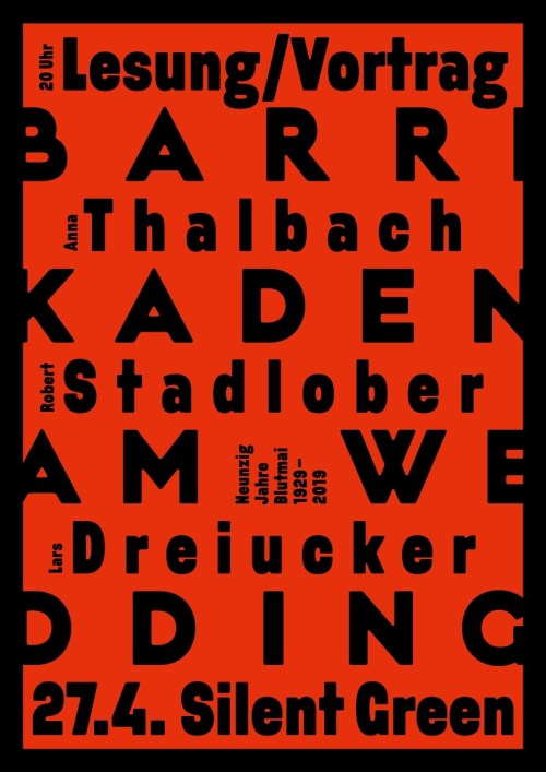 Am 27.4. lese ich mit Anna Thalbach gemeinsam aus dem Klassiker „Barrikaden am Wedding“ Lars Dreiucker erzählt dazu Wissenswertes zu Zeit und Politkontext und gemeinsam werden wir versuchen Bezüge zum Berlin von Heute herzustellen. Und der Frage nachzugehen, warum zumindest in meinem Geschichtsbuch zu Schulzeiten nichts vom Blutmai stand. Kommen Sie vorbei, hören Sie zu, reden Sie mit. Welche Stadt, welche Geschichte, welches Leben wollen wir.