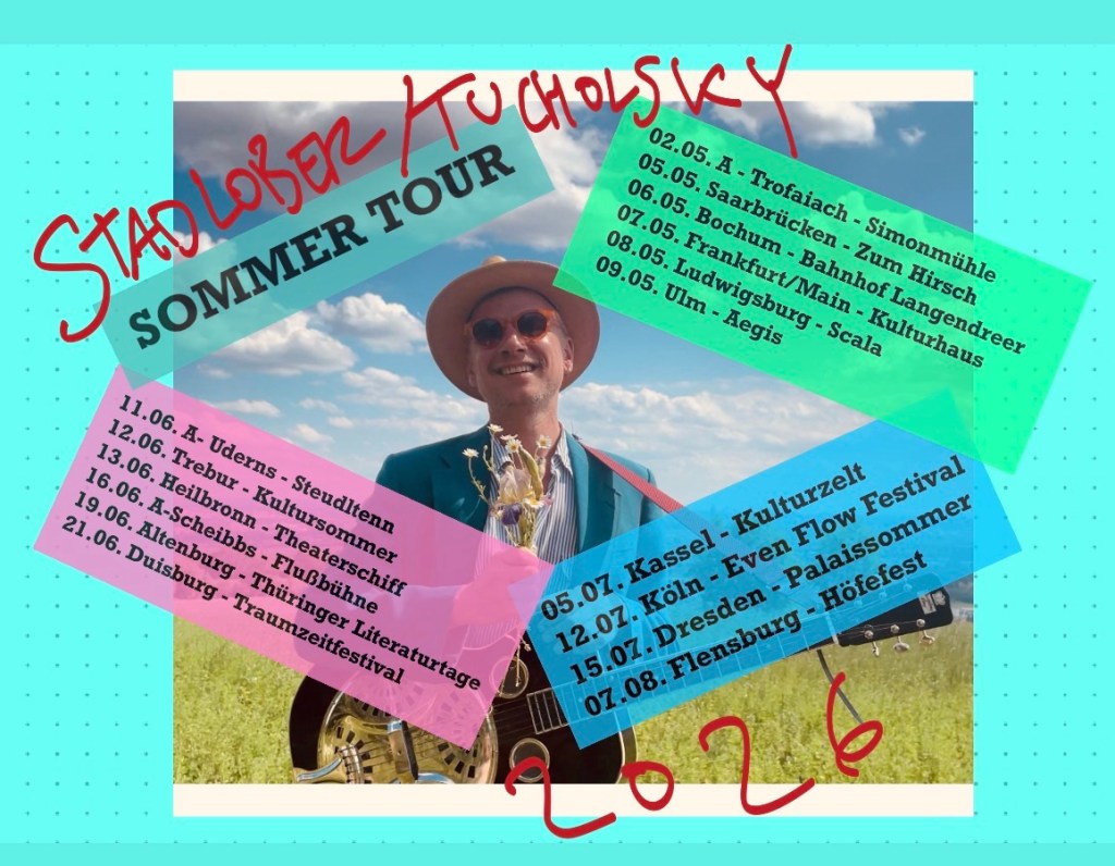 Wilde Zeiten, wilde Träume, wilder Sommer. Daniel und ich sind wieder unterwegs. In Sachen Tucholsky, aber auch mit neuen Liedern. Hab nämlich die neue Platte angefangen: „Café Utopia – Auf ein Glas mit der verjagten Zukunft„ Vertonungen von Else Lasker-Schüler, Joseph Roth, Masha Kaléko, Erich Mühsam, Irmgard Keun, Klabund, Rose Ausländer und: BRECHT uvm. Wird auch wieder ein Buch beim Weltbesten Verbrecher Verlag geben. Im Frühjahr 27.